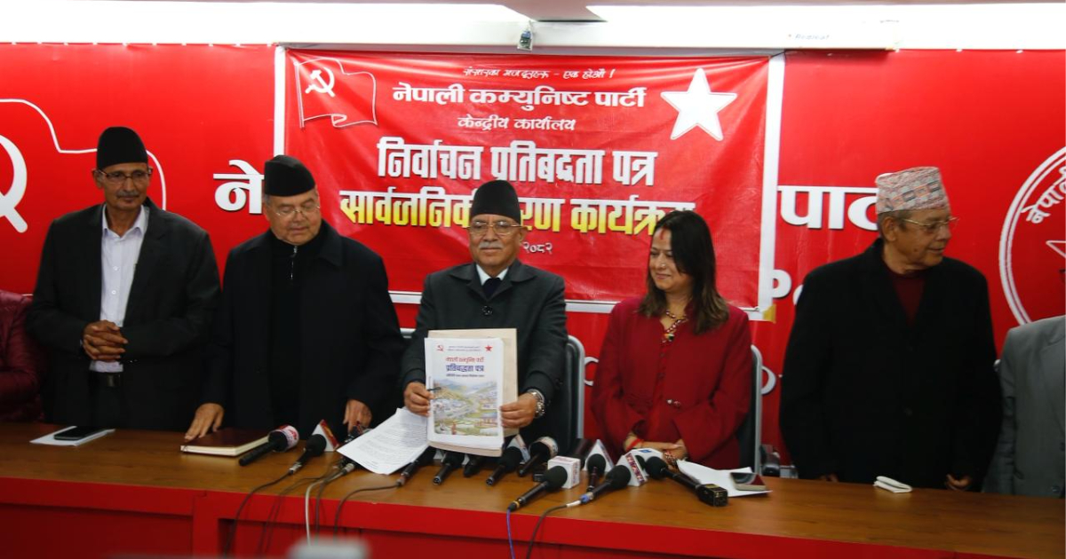 नेपाली कम्युनिष्ट पार्टीले आर्थिक सुधार, सुशासन र सामाजिक न्यायलाई केन्द्रमा राख्दै आगामी प्रतिनिधिसभा निर्वाचन २०८२ का लागि संक्षिप्त प्रतिबद्धता पत्र सार्वजनिक गरेको छ । पार्टी कार्यालय पेरिसडाँडामा आज आयोजित विशेष कार्यक्रममा पार्टी संयोजक पुष्पकमल दाहाल ‘प्रचण्ड’ले पार्टीको निर्वाचन लक्षित प्रतिबद्धता पत्र सार्वजनिक गर्दै आर्थिक सुधारको नयाँ चरणमा मुलुक प्रवेश गराउन आवश्यक नीति तथा कार्यक्रम अघि सारिएको बताए । प्रतिबद्धता पत्रमा आत्मनिर्भर राष्ट्रिय अर्थतन्त्र निर्माण, स्थानीय तह र समुदायबाट समाजवादको अभ्यास, तथा नेपाली विशेषतामा आधारित समाजवादलाई सामाजिक क्रान्तिको मूल बाटोका रूपमा अगाडि बढाइने उल्लेख गरिएको छ ।