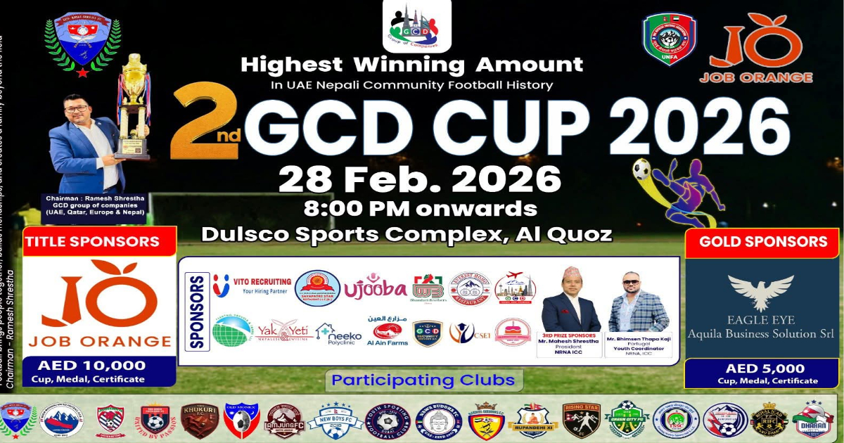 संयुक्त अरब इमिरेट्स (यूएई) मा रहेका नेपाली समुदायबीच खेलकुदमार्फत एकता र सामाजिक सद्भाव सुदृढ गर्ने उद्देश्यले दोस्रो जीसीडी कप आगामी शनिबार फेब्रुअरी २८ देखि दुबईको अल क्वोजस्थित डुल्स्को स्पोट्र्स कम्प्लेक्समा सुरु हुँदैछ । प्रतियोगिता यूएईमा नेपाली समुदायबीच हुँदै आएका फुटबल प्रतियोगितामध्ये सर्वाधिक पुरस्कार राशियुक्त रहेको छ । आयोजकका अनुसार विजेता टोलीले १० हजार दिराम (करिब चार लाख नेपाली रुपैयाँ) नगद पुरस्कार प्राप्त गर्नेछन् भने उपविजेताले ५ हजार दिराम हात पार्नेछन् ।