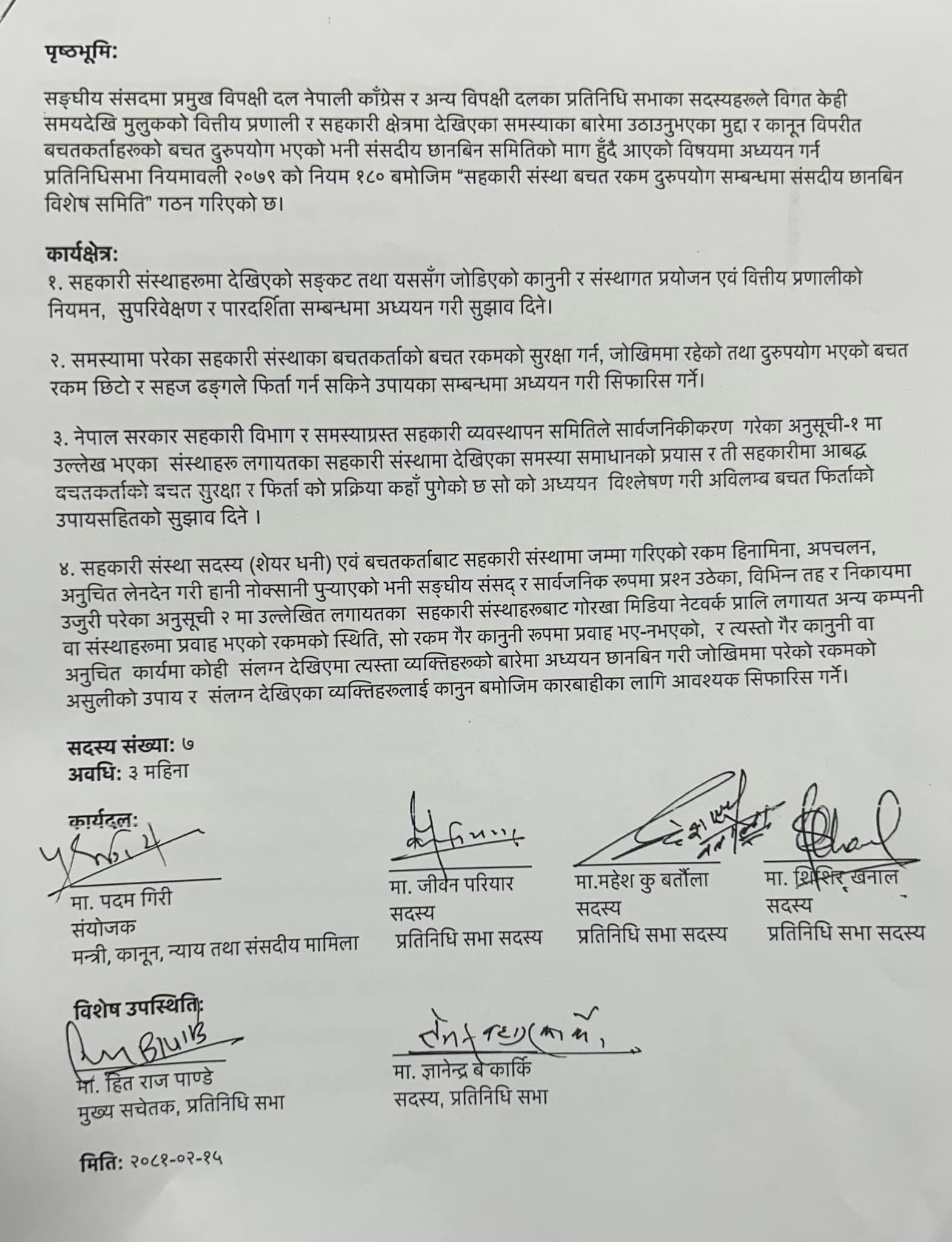 मंगलबार सिंहदरबारमा बसेको कार्यदलको बैठकमा सहकारी छानबिन समितिको कार्यदेशमा ४ बुँदे सहमति जुटेको हो । कार्यदल सदस्यहरूले हस्ताक्षर गरिसकेको कार्यदेशमा समस्याग्रस्त सहकारीको छानबिन र अनुसन्धान तथा त्यस्ता सहकारीमा जोडिएका व्यक्तिका हकमा समेत छानबिन गर्ने विषय समेटिएको बताइएको छ । कार्यदलमा सहमति जुटेसँगै ७ सदस्यीय समिति गठन गर्ने तयारी छ । मंगलबार बस्ने संसद् बैठकमा समितिको घोषणा गर्ने तयारी दलहरूको छ ।