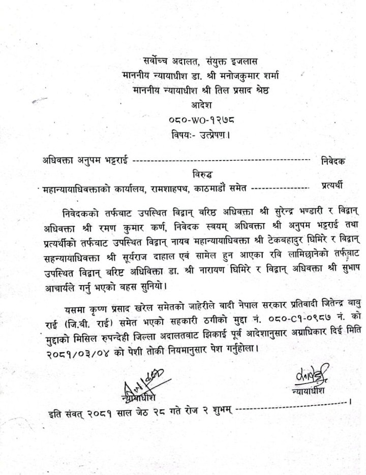 न्यायाधीशद्वय डा. मनोजकुमार शर्मा र तिलप्रसाद श्रेष्ठको इजलासले सोमबार उक्त आदेश गरेको हो । लामिछानेलाई निलम्बन गर्नुपर्नेसहितका माग राखेर सर्वोच्चमा परेको रिटलाई अग्राधिकार दिँदै आगामी असार ४ गते पेशी तोकिएको छ । ‘यसमा कृष्णप्रसाद खरेलसमेतको जाहेरीले वादी नेपाल सरकार प्रतिवादी जितेन्द्रबावु राई (जीबी)समेत भएको सहकारी ठगीको मुद्दा नम्बर ०८०-८१-०९८७ नम्बरको मुद्दाको मिसिल रुपन्देही जिल्ला अदालतबाट झिकाई पूर्व आदेशानुसार अग्राधिकार दिई मिति २०८१/०३/०४ को पेशी तोकी नियमानुसार पेश गर्नुहोला,’ आदेशमा भनिएको छ ।