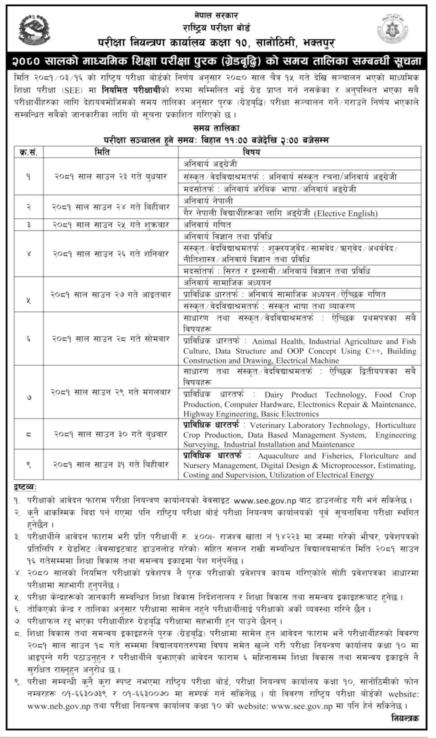 परीक्षा साउन २३ गतेदेखि ३१ गतेसम्म सञ्चालन हुनेछ । एसईईमा नियमित परीक्षार्थीको रूपमा सम्मिलित भई ग्रेड प्राप्त गर्न नसकेका र अनुपस्थित भएका सबै परीक्षार्थीहरूका लागि पूरक (ग्रेडवृद्धि) परीक्षा सञ्चालन हुन लागेको हो । परीक्षाको आवेदन फाराम परीक्षा नियन्त्रण कार्यालयको वेवसाइट www.see.gov.np बाट डाउनलोड गरी भर्न सकिने बोर्डले जनाएको छ ।