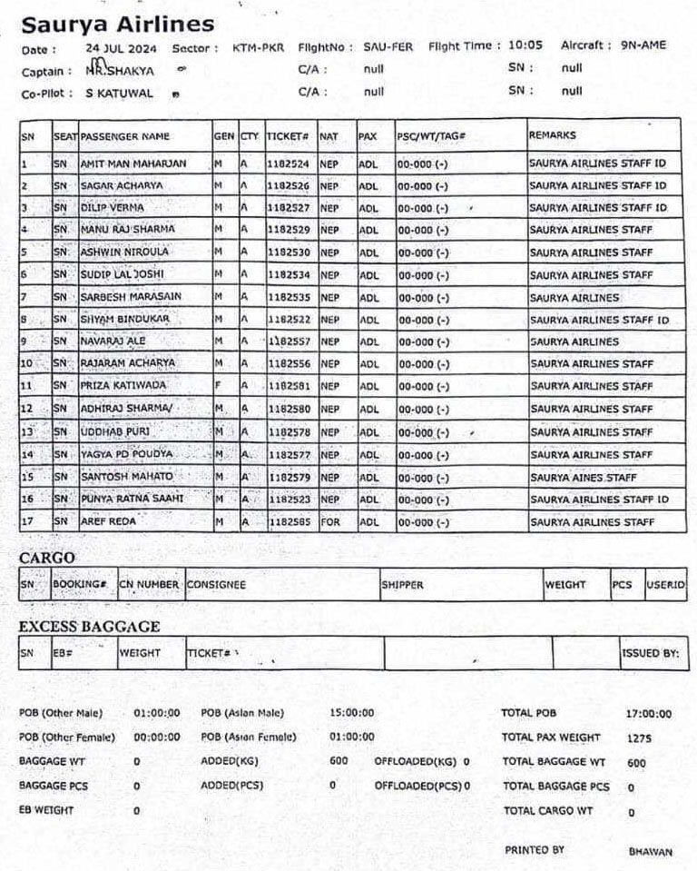 क्याप्टेन एम.आर शाक्यले उडाएको विमानमा सुशान्त कटुवाल को-पाइलटका रूपमा रहेका थिए । अन्य १७ जना एयरलाइन्सकै कर्मचारी रहेको पाइएको छ । १७ मध्ये १ महिला र अन्य पुरुष छन् । नेपाल प्रहरीका महानिरीक्षक आईजीपी वसन्त कुँवरका अनुसार १७ जनाको मृत्यु भएको छ । एकजना विदेशी र बाँकी नेपाली हुन् । कुँवरका अनुसार क्याप्टेन शाक्यसहित २ जनाको केएमसी अस्पतालमा उपचार भइरहेको छ ।